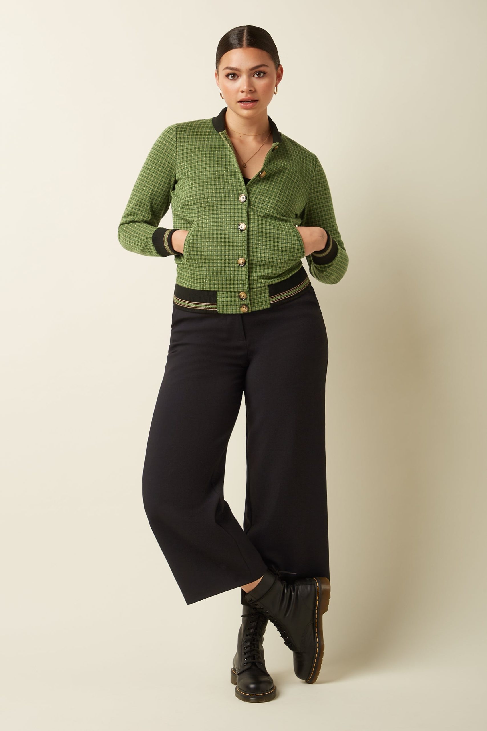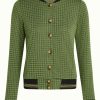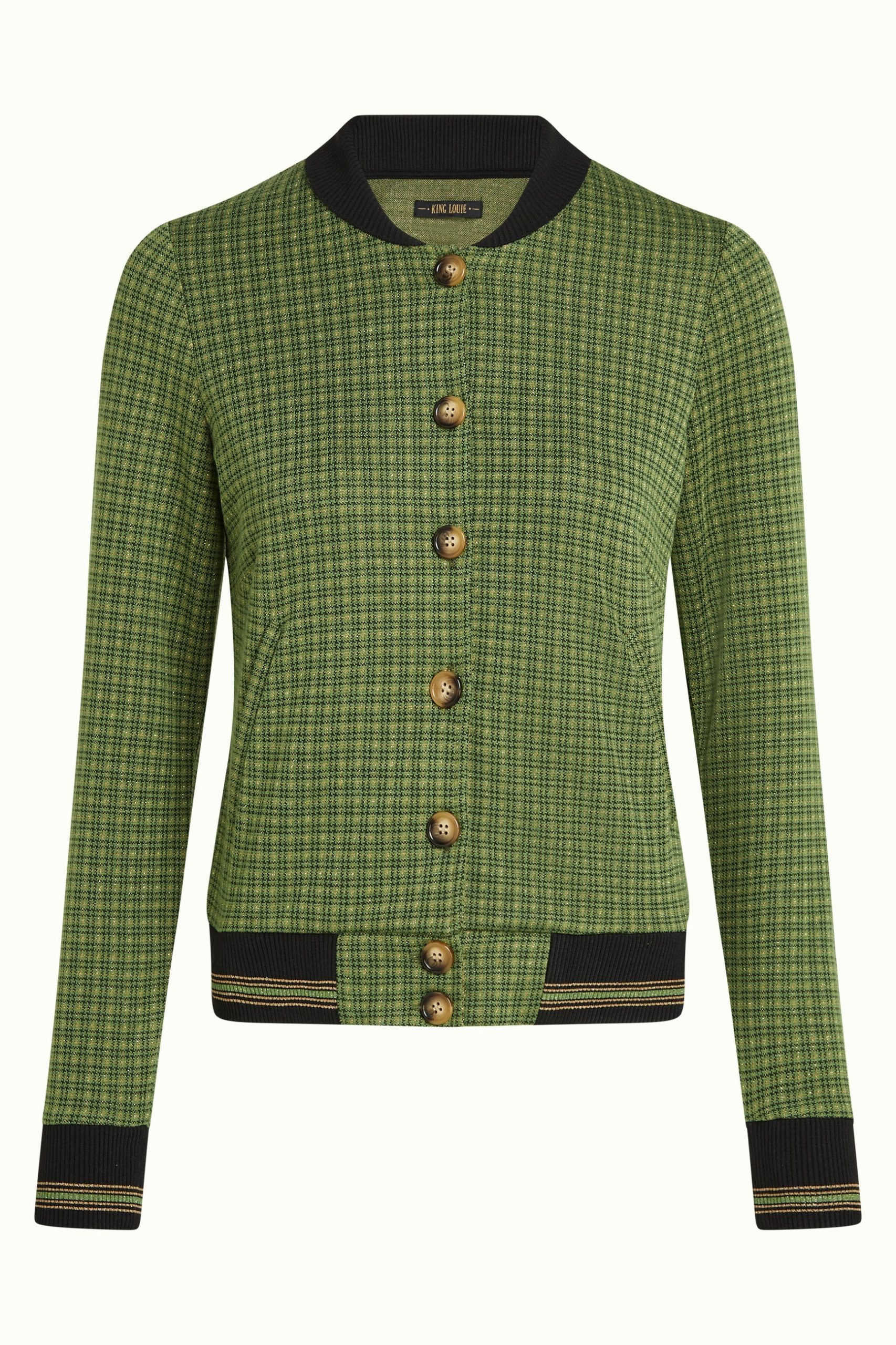 The Cleo Jacket Ivy Check combines sophistication with timeless style. Made from non-stretch knit jacquard, it features a glittering checkered print, long sleeves, and a knitted collar. Welt pockets and a button closure complete this elegant, polished look.